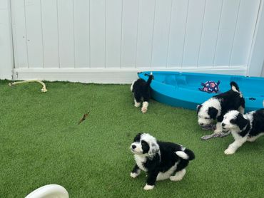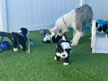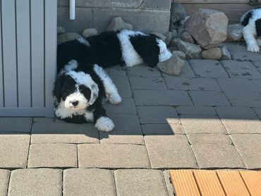 Willow and Teddy are the parents of my upcoming mini/medium Sheepadoodle litter. My mini to medium Sheepadoodles, typically weigh 35-50 pounds, are the perfect family companions. Their parent breeds can exceed 100 pounds, while 35 - 50 lbs is not a tiny dog it is still substantially smaller then the parent breeds. Known for their friendly and gentle temperament, Sheepadoodles are great with children and adults alike. Their playful nature and intelligence make them ideal for family activities, whether it's a game in the yard or a cozy evening together. With their hypoallergenic coats and loving disposition, our mini Sheepadoodles are truly cherished family members.